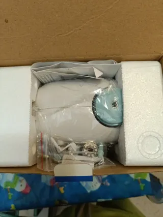 Máquina de coser Singer en buen estado. Ideal para tus proyectos de costura. - Diseño clásico en blanco y azul. - Incluye accesorios y caja original.