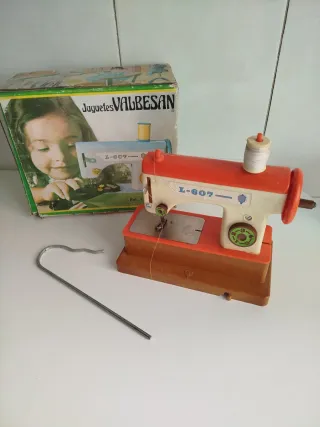 Máquina de coser de juguete vintage de la marca Valbesan, modelo L-607. Un clásico para coleccionistas o para revivir la nostalgia. - Diseño retro con base de madera. - Detalles en color naranja y blanco. - Incluye bobina de hilo y gancho de sujeción.