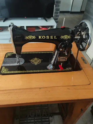 Máquina de coser antigua de la marca Kosel, presentada en su mueble original. - Diseño clásico en color negro. - Detalles dorados. - Incluye el mueble de madera.