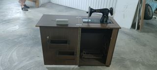 Maquina de coser antigua Se guarda en el propio mueble donde está montada Pequeño desperfecto en el mueble por la parte de atrás (foto donde se muestra)