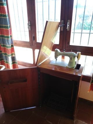 Máquina de coser antigua en funcionamiento y con mueble de madera. Necesita engrasar.