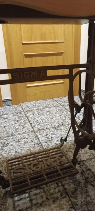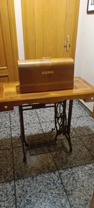 Máquina de coser antigua con su tapa de madera. Mueble de madera y hierro Muy bien cuidada, solo la tapa tiene un golpe que se ve en foto Un cajón tubo carcoma y se sano - Marca: Sigma - Tapa de madera con asa metálica y llave original todo La caja metálica e instrucciones Va a pedal solo le falta correa Se le puede poner motor Se ha cosido hasta no hace mucho