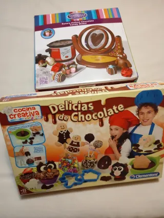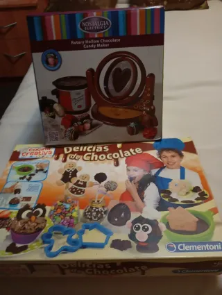 Set de cocina creativa Delicias de Chocolate de Clementoni. Incluye una máquina para hacer chocolate y moldes. - Máquina Rotary Hollow Chocolate Candy Maker de Nostalgia Electrics.(Nueva sin estrenar) - Juego Delicias de Chocolate de Clementoni. (Utilizado una vez) - Incluye moldes para galletas y figuras. - Ideal para crear dulces y postres de chocolate. El precio es por las dos cosas