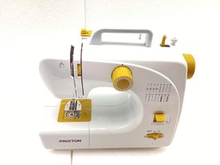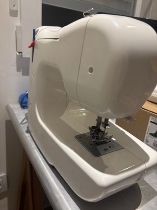 Máquina de coser de color blanco con detalles en azul y amarillo. Ideal para iniciarse en la costura. - Diseño moderno y compacto. - Incluye accesorios básicos.