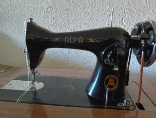Máquina de coser clásica de la marca Alfa, modelo antiguo. Funciona perfectamente. - Diseño vintage en color negro. - Incluye su mesa de madera original. - Ideal para coleccionistas o decoración.