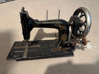 Máquina de coser Singer clásica, ideal para coleccionistas o decoración. - Diseño vintage en color negro con detalles dorados. - Incluye pedal para funcionamiento.