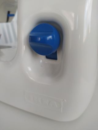 Máquina de coser de la marca YISSVIC en color blanco con detalles en azul. - Diseño compacto y moderno. - Asa para facilitar su transporte. - Dial selector de puntadas. - Como nueva!