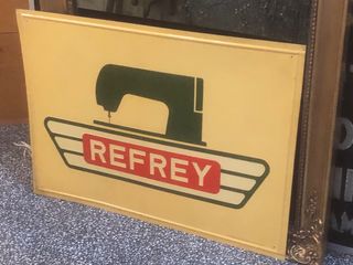 proviene del almacen del distribuidor de la marca, nunca ha sido usada. Chapa publicitaria, antigua de la marca Refrey, con un diseño de máquina de coser. en muy buen estado y numerada 7 - Chapa metálica. - Fondo amarillo. - Texto REFREY en rojo.70cm x50cm