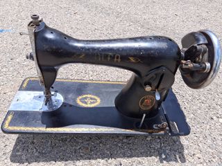 Máquina de coser antigua con detalles decorativos dorados. Ideal para coleccionistas o pieza decorativa. - Mecanismo de manivela. - Base de madera. - Diseño clásico. - Funciona. - Se puede restaurar o dejar tal cual ya que como antigüedad decora mucho.