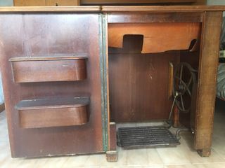 mueble antiguo para máquina de coser. Recisada por fabricante de maquinas de coser: muy buen estado aunque necesitaría una pequeña restauración (de apeox 50€), de ahí su precio. En perfectas condiciones valdría 150€. Precio cerrado.