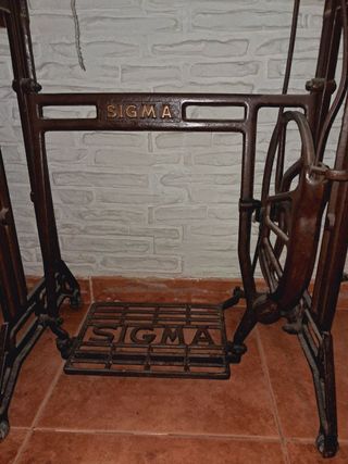 Máquina de coser antigua de la marca Sigma, con su mueble de madera y base de hierro. - Diseño clásico y funcional. - Mueble de madera con cajones. - Base de hierro forjado.