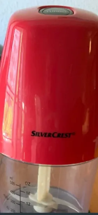 Picadora Silvercrest de color rojo con función turbo. - Diseño compacto y moderno. - Jarra medidora con marcas en ml y oz.