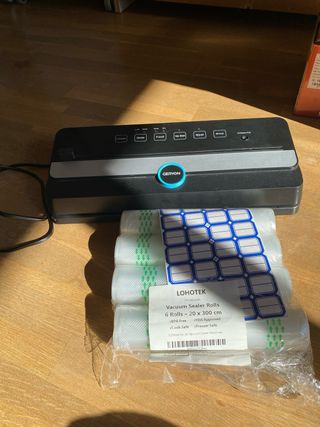 Envasadora al vacío Geryon con varios modos de funcionamiento. - Incluye 4 rollos de bolsas para envasar al vacío (20 x 300 cm). - Rollos libres de BPA y aptos para congelador. - Aprobados por la FDA y seguros para cocinar.