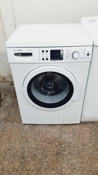 Lavadora de carga frontal Bosch Serie 6. De 8 kg clase a+++ bajo consumo con garantía de 6 meses+ transporte - Color blanco. - Panel de control con pantalla digital. - Selector de programas giratorio. - Puerta frontal redonda con marco negro.