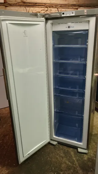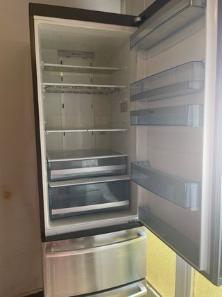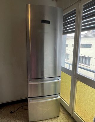 La nevera esta en muy buen estado pero la parte de arriba falla y no funciona bien, el congelador funciona perfectamente pero la parte de arriba funciona por unos dos o tres días y deja de funcionar y hay que desenchufarla hasta que no quede hielo luego al enchufarla vuelve a funcionar. Le hemos cambiado una pieza por unos 50€ pero sigue igual. Nevera vertical de la marca Haier con acabado en acero inoxidable. Cuenta con tres cajones en la parte inferior. - Diseño moderno. - Acabado en acero inoxidable.
