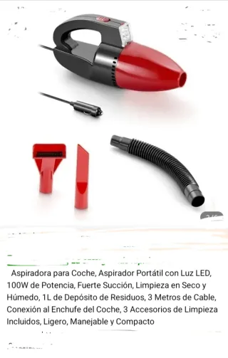 Aspirador portátil para coche con luz LED y gran potencia. - 100W de potencia. - Fuerte succión. - Limpieza en seco y húmedo. - Depósito de residuos de 1L. - Cable de 3 metros. - Conexión al enchufe del coche. - Incluye 3 accesorios de limpieza. - Ligero, manejable y compacto. A estrenar