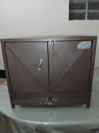 Horno de gas de color marrón oscuro. - Puertas frontales con cierre de seguridad. - Asa metálica en la puerta izquierda. - Pequeño cajón inferior con pomo.