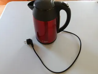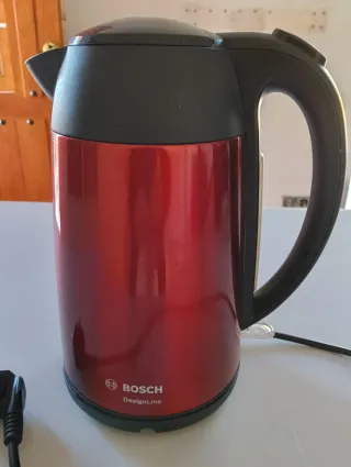 Hervidor de agua Bosch DesignLine con un acabado metálico rojo brillante. - Diseño moderno y elegante. - Marca: Bosch. - Línea: DesignLine. Funciona perfectamente pero hay que hacerle una limpieza de cal