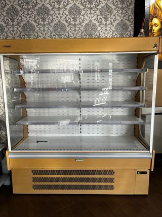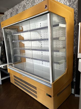 Frigorífico expositor con estructura de madera y puertas de cristal. - Diseño moderno y elegante. - Estantes interiores ajustables. - Base con rejillas de ventilación.