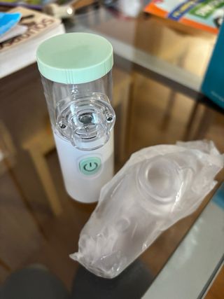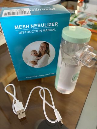 Nebulizador portátil de malla, diseñado para ser silencioso y de bajo consumo. - Compacto y fácil de transportar. - Incluye manual de instrucciones. - Cable de carga USB.