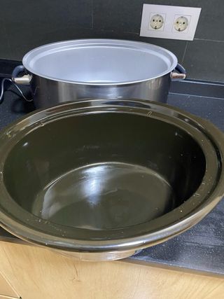 Olla de cocción lenta eléctrica, ideal para preparar comidas de forma sencilla y saludable. Su diseño ovalado y su interior antiadherente facilitan su uso y limpieza. - Interior de cerámica negra. - Exterior metálico plateado. - Asas laterales para un fácil transporte.