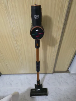 Aspiradora Ufesa en color negro y naranja, con poco uso. - Diseño ligero y ergonómico. - Incluye tubo extensible. - Base para suelos duros.