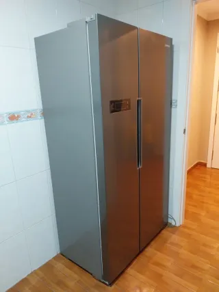 Frigorífico Corbero de estilo americano. - Diseño moderno en color gris. - Puertas enfrentadas para fácil acceso. - Dispensador de agua integrado.