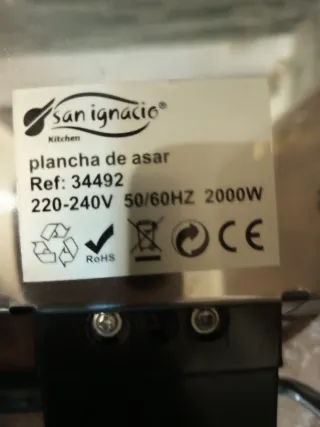 Plancha de asar de la marca San Ignacio - Modelo: 34492 - Potencia: 2000W - Voltaje: 220-240V - Frecuencia: 50/60Hz - Certificación RoHS - Símbolo CE Escucho ofertas no absurdas