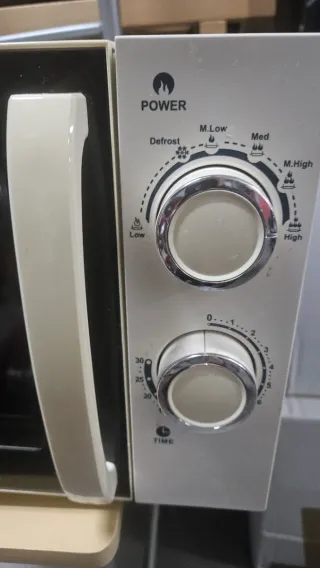 Microondas de color blanco, perfecto para tu cocina. Cuenta con mandos giratorios para ajustar la potencia y el tiempo. - Diseño compacto. - Panel de control intuitivo.