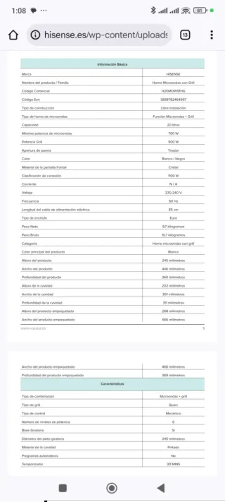 Microondas con grill marca Bluesky BMO20M-18. E Se usó muy poco, no está ni amarillo. Tiene el plato y la tapa de plástico, lo único q tiene restos de precinto de haberlo embalado para q no cogiera polvo, pero q con alcohol se quita