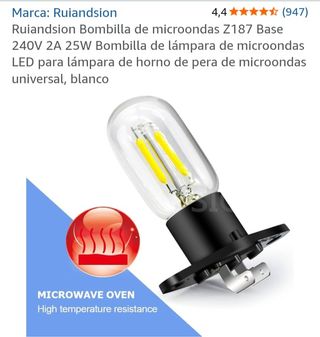 Bombilla LED para microondas Ruiandsion Z187. Es blanca y tiene una base universal. - 240V, 2A, 25W. - Alta resistencia a la temperatura. - Perfecta para horno microondas.