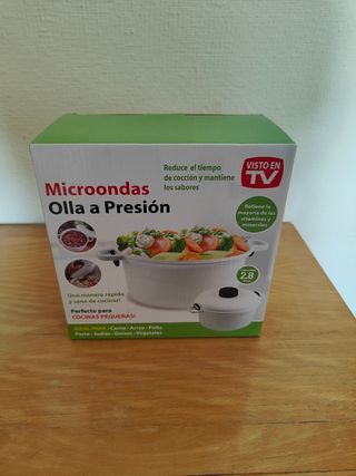 Olla a presión para microondas, ideal para cocinas pequeñas. Es una manera rápida y sana de cocinar. Conserva la mayoría de las vitaminas y minerales. - Capacidad: 2.8 litros. - Perfecta para cocinar carne, arroz, pollo, pasta, judías, guisos y vegetales. - Reduce el tiempo de cocción y mantiene los sabores.