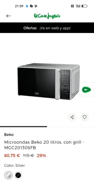 664688014 659500057 Productos de OUTLET y OCASION sólo se sirven en la Comunidad de Madrid, resto de productos se envían a toda España (península) Color: Plata Capacidad de la cavidad:23 L Potencia máxima de microondas:900 W Número de niveles de potencia de microondas:5 Grill:Sí Potencia del grill:1050 W Cocción automática:Sí Número de funciones de cocción automática:8 Descongelar:Función estándar Seguro para niños:Sí Luz interior:Sí Temporizador de microondas:Digital Duración máxima del temporizador:95 min. Inicio rápido:Sí Tipo de apertura de puerta:Lateral derecha Plato giratorio:Sí Diámetro del plato giratorio:27 cm Tipo de cav