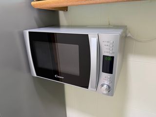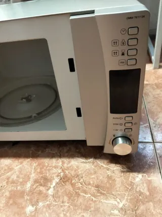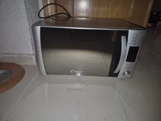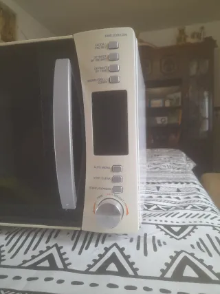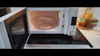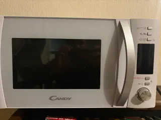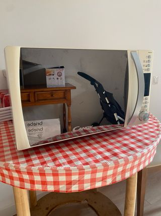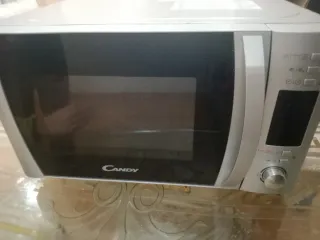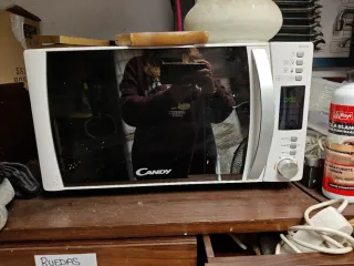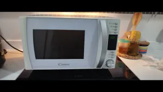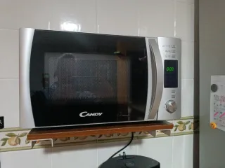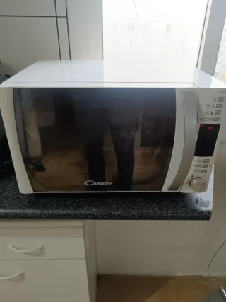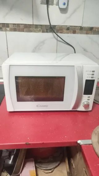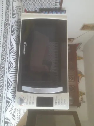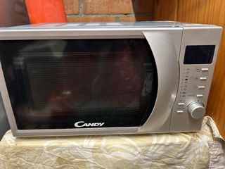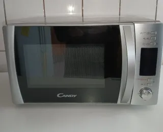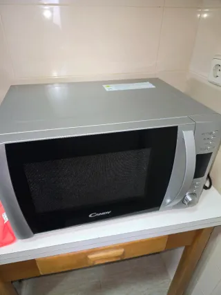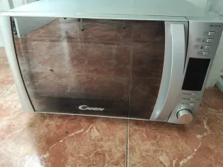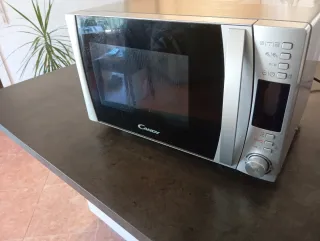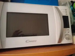 Microondas Candy en buen estado, con mandos electrónicos y función grill. Diseño con frontal espejo, cómodo y fácil de usar. Capacidad aproximada 20–25 litros, ideal para uso diario: calentar, descongelar y gratinar. Incluye plato giratorio de cristal. Funciona perfectamente. Medidas aproximadas: 50 × 30 × 38 cm. Se vende por cambio de cocina.