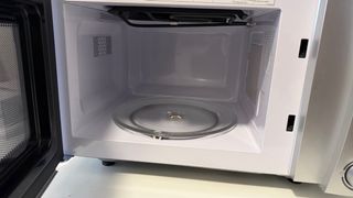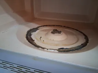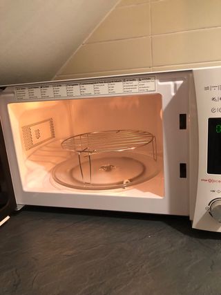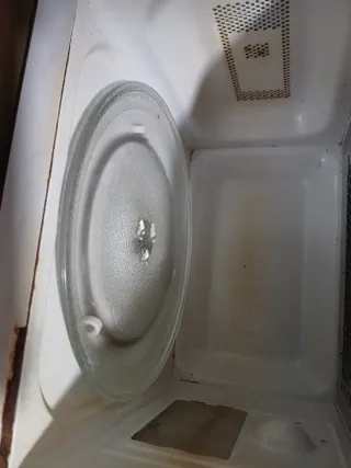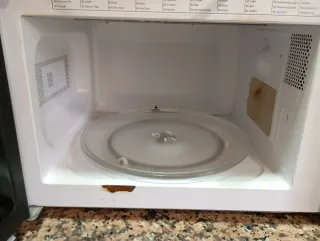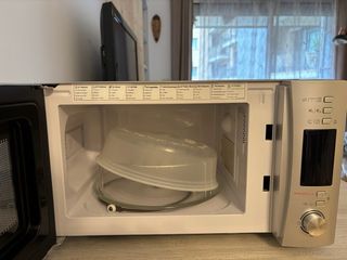 Microondas de la marca Candy en color blanco. Un electrodoméstico práctico para tu cocina. - Diseño moderno y funcional. - Panel de control intuitivo. Microondas con grill funciona perfectamente pero se ha levantado la zona de las ruedas del plato giratorio