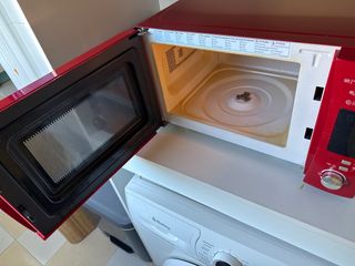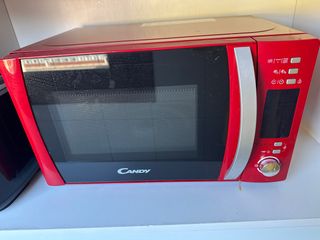 Microondas de la marca Candy en color rojo.  tiene algunas manchas de pintura hay que lavarlas por eso el precio. - Diseño moderno y compacto. - Panel de control intuitivo. - Puerta con asa ergonómica.