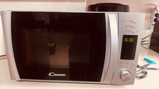 Microondas de la marca Candy en color plata. Un electrodoméstico práctico para tu cocina. - Diseño moderno y compacto. - Panel de control intuitivo. - Funciona perfectamente. - Tiene algún defecto estético en el interior
