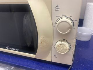 Microondas de la marca Candy. - Diseño moderno y compacto. - Interior espacioso para tus comidas. - lleva un pequeño golpe parte superior derecha, se ve en la foto, no afecta a su funcionamiento es solo estética