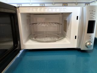 Buen estado. Modelo CMXG 25DCS en color plateado y negro. Dimensiones: Ancho 51.3cm, profundidad 42.9cm y altura 30.7cm. Capacidad 25L. Potencia 900w. Grill 1000 w. Cuenta con un diseño moderno y funcional. - Puerta con tirador integrado. - Panel de control digital. - Mando giratorio para ajustes.