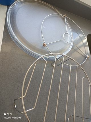 Rejilla metálica redonda para microondas o grill. Ideal para cocinar alimentos a diferentes alturas. - Material: Metal cromado. - Diseño: Redondo con patas.