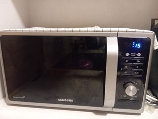 Microondas, marca Samsung. 23L 900W/Grill 1100W. Color plata (inox). Con plato rotatorio. Interior de cerámica. Solo hay que sacarle el brillo. Casi no se ha usado. Está en muy buen estado. SOLO VENDO POR ENVÍO.