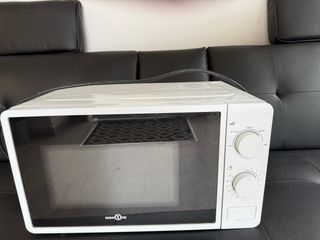 Microondas de color blanco, con un diseño moderno y compacto. - Puerta con cristal negro. - Dos mandos giratorios para ajustar tiempo y potencia. - Marca: HIGH ONE.