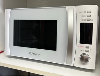 Microondas de la marca Candy en color blanco. Esta nuevo ya que se ha usado muy poco. Se vende por mudanza. - Puerta con acabado en cristal blanco. - Panel de control digital. - Asa plateada.