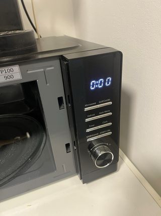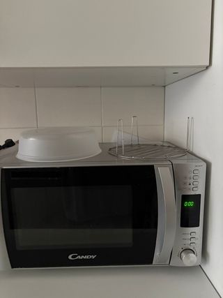 Microondas Candy en color plateado y negro. Cuenta con un diseño moderno y compacto, ideal para cualquier cocina. - Puerta con tirador. - Panel de control con botones y dial. - Pantalla digital. - No se realiza envio. - Recoger entre el 28 y el 30 de enero.