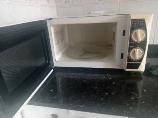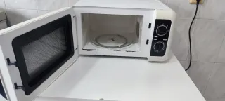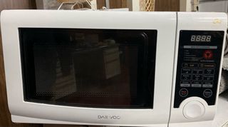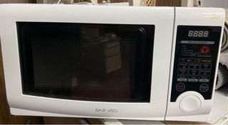 Microondas Daewoo en color blanco, con mandos giratorios para potencia y tiempo. Tiene batalla pero funciona perfectamente. Vendemos por mudanza