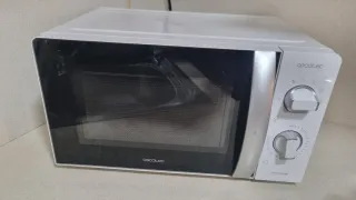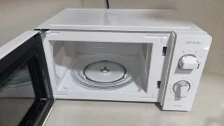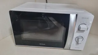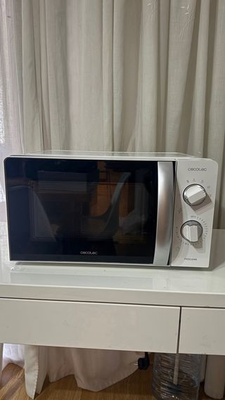 Microondas Cecotec en color blanco. Diseño moderno y compacto. - Puerta con acabado en cristal negro. - Panel de control con mandos giratorios. - Asa plateada. - Modelo Proclean. -Poco uso, se vende por mudanza.