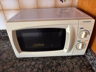 Microondas de sobremesa marca Hyundai en color blanco. Cuenta con dos mandos giratorios para ajustar la potencia y el tiempo. - Mandos de ajuste de potencia y tiempo. - Diseño compacto. Funciona perfectamente lo único el color de desgaste por los añod