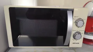 Microondas de la marca Westwood en color crema, con función grill. - Diseño retro. - Mandos giratorios. - Puerta con asa plateada.
