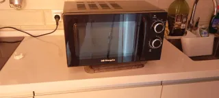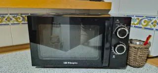 Microondas Orbegozo en color negro. Un electrodoméstico práctico para tu cocina. En buen estado aunque con algunas señales de uso, pero funcionando perfectamente - Diseño moderno y compacto. - Panel de control con mandos giratorios. Medidas: 45 x 39