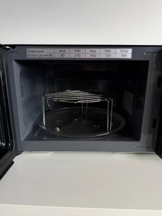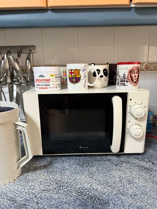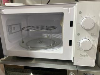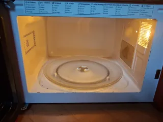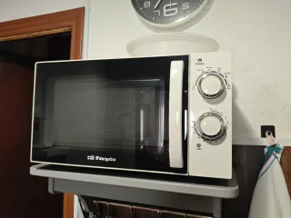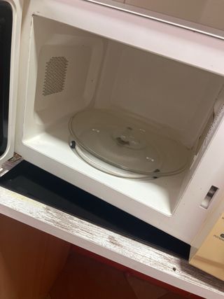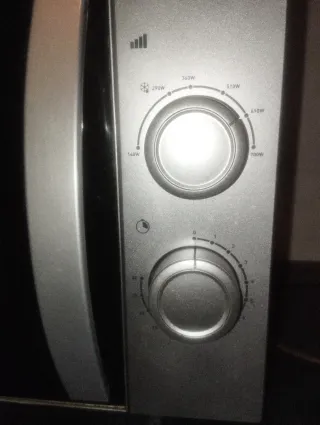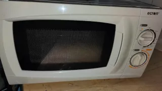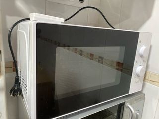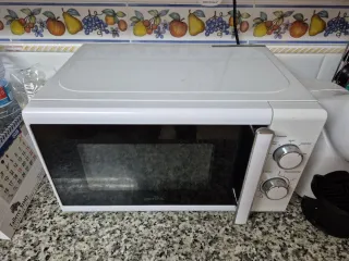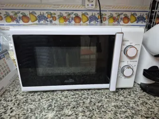 Microondas de color blanco, perfecto para tu cocina. - Diseño compacto. - Mandos giratorios para potencia y tiempo. Tiene marcas y desperfectos por el paso del tiempo pero funciona perfectamente. No es negociable, estará anunciado hasta el sábado.